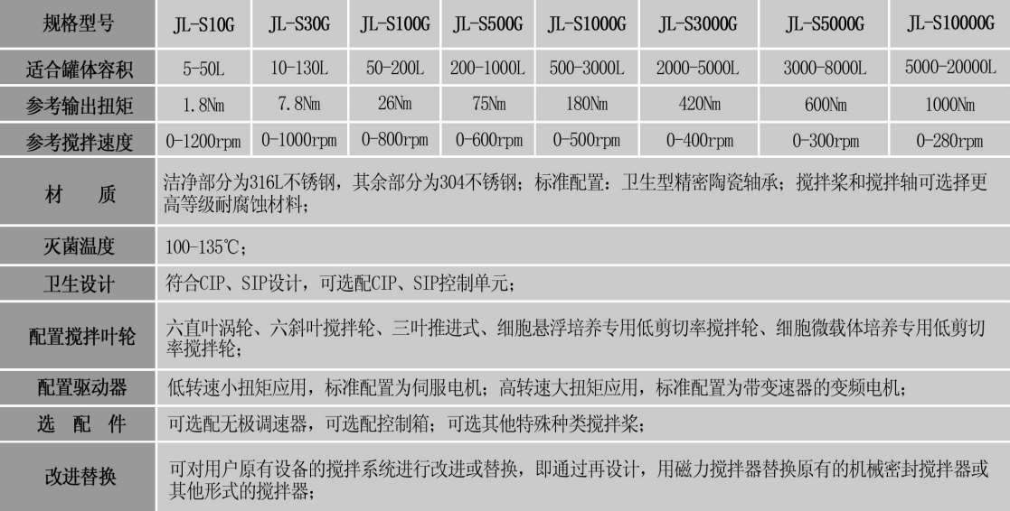 璟良公司經過多年專心研究,推出一系列符合食品、制藥生產要求,可實現在位清洗(CIP )、在位滅菌(SIP)的衛生型頂置式磁力攪拌裝置。頂置式磁力驅動攪拌采用金屬隔離套解決密封問題,電機驅動軸通過外轉子和內轉子的磁場耦合,將驅動力傳遞到攪拌軸和攪拌葉輪,驅動軸和攪拌軸之間沒有物理的連接,沒有類似機械密封那樣的動態磨擦部件,屬于靜態隔離密封技術,可以長期無泄漏連續運行。頂置式磁力攪拌器完全可以勝任任何應用場合,不存在功率做不大、扭矩過小、速度過慢的問題。